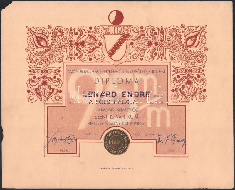 Beschreibung: 1938 Bp., Lénárd Endre - A föld halála, Magyar Amatőrfilm Szövetség diploma