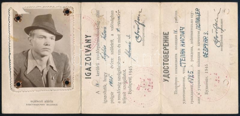 1945 Kétnyelvű fényképes igazolvány rendőr számára https://www.darabanth.com/de/415-Fernauktion/415.0/Kunst-Dokumente-andere-Sammelgebiete/Dokument~500018/1945-Ketnyelvu-fenykepes-igazolvany-rendor-szamara~II2603636