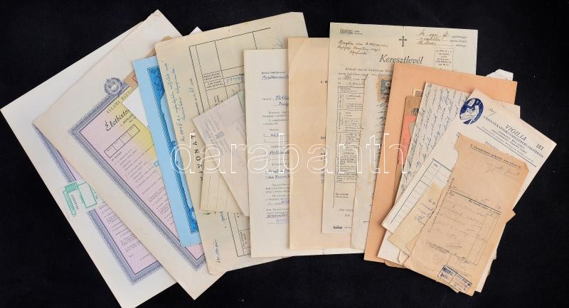 Beschreibung: Kisebb vegyes papírrégiség tétel (közte kézzel írt munkáltatói ajánlólevél, keresztlevél, kitöltetlen nyomtatványok, stb.)