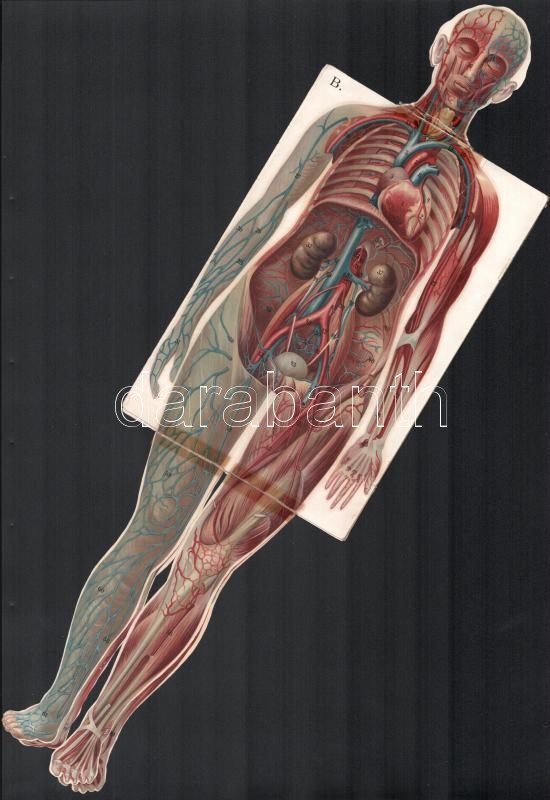 Beschreibung: cca 1940 Janitsáry István gyógyszertára II. ker. nagy méretű receptboríték, benne az emberi test szöveteit és izmait bemutató széthajtható ábrákkal.