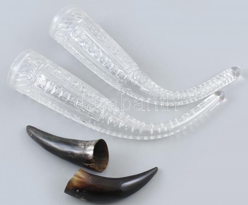 Beschreibung: 4 db ivókürt: 2 db nagyméretű, díszes csiszolt üveg, h: 24-26 cm + 2 db kisebb szaru, h: 11-12 cm