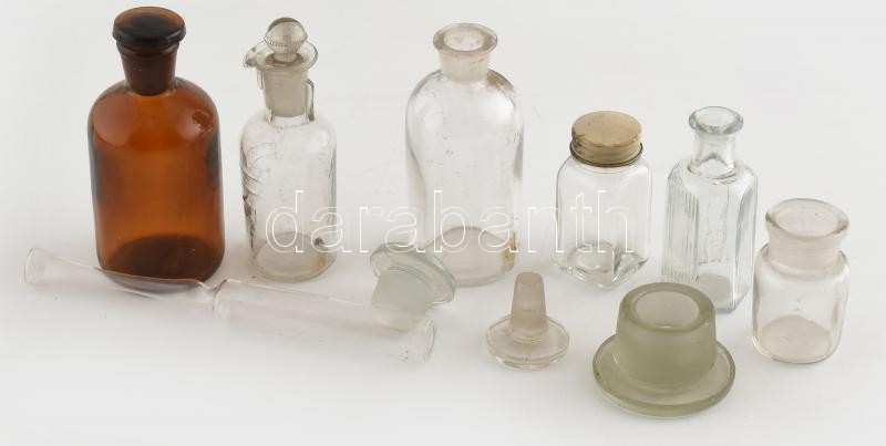 6db gyógyszeres / patika üveg, kopásnyomokkal. https://www.darabanth.com/de/415-Fernauktion/415.0/Kunst-Dokumente-andere-Sammelgebiete/Flohmarkt~500012/6db-gyogyszeres-patika-uveg-kopasnyomokkal~II2602792