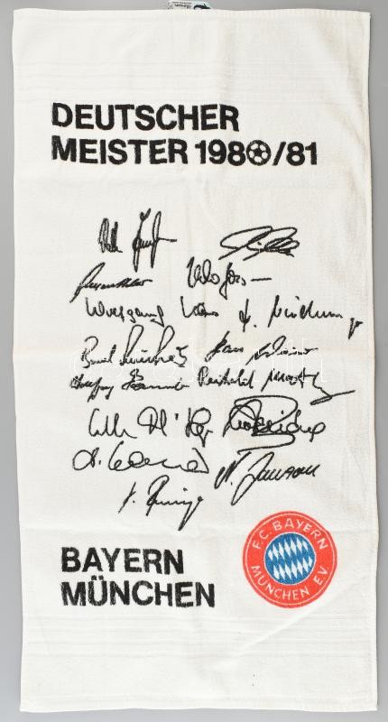 FC Bayer München törölköző, az 1980/81-es szezon bajnokcsapatának nyom... https://www.darabanth.com/de/415-Fernauktion/415.0/Kunst-Dokumente-andere-Sammelgebiete/Flohmarkt~500012/FC-Bayer-Munchen-torolkozo-az-198081-es-szezon-bajnokcsapatanak-nyomtatott-alairasaival-~II2601265