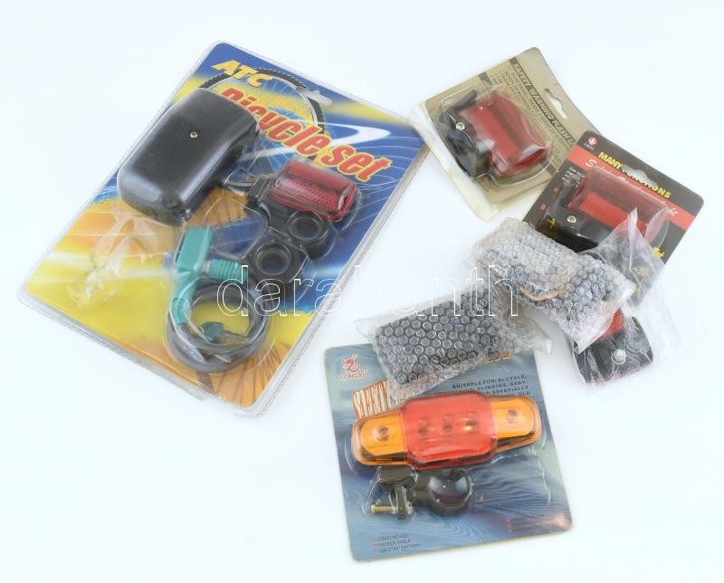 Beschreibung: Kerékpáros kiegészítők: lámpák, fényvisszaverő prizmák, lakat, összesen 10 db, nagyrészt eredeti csomagolásban