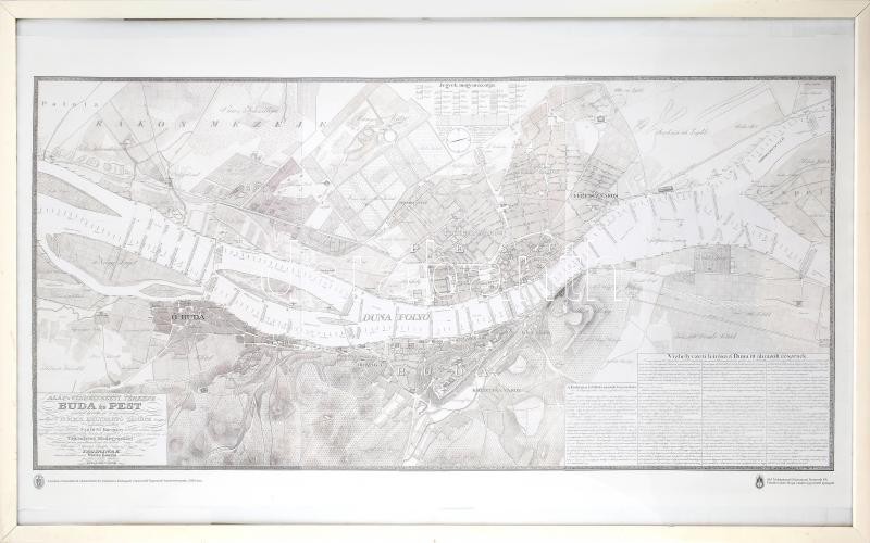2009 Alap 's vizhelyzeti térképe Buda és Pest szabad királyi fő Városainak, mellyet a' N. M.M.K. Helytartó Tanács kegyes Engedelme mellett a' magyar országi Tekintetes Építő fő Kormány kebelében találtató legujabb 's legjobb eredeti térképekből, és tökéletes vízhelyzeti adatokból 1"=100öles mértékre készítvén, a' Tekintetes Hídegyesület' Honunk javán fáradhatatlanúl munkálkodó Tekintetes Nemes és Nemzetes tagjainak alázatos tisztelettel ajánl Vörös László a' Kiadó és országos dunamérési hiteles Földmérő Buda MDCCCXXXIII, Vörös László 1833-as térképének modern reprintje, Bp., Budapesti Városvédő Egyesült-HM Térképészeti Közhasznú Nonprofit Kft., üvegezett keretben, 52x105 cm, keret: 71x114 cm