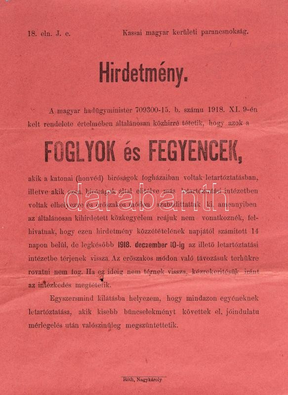 1918 Hirdetmény. A magyar hadügyminiszter hirdetménye, foglyok és fegyencek tárgyában, Kassai magyar kerületi parancsnokság, Nagykároly, Róth-ny., kis lyukkal, hajtásnyomokkal, 32x23 cm