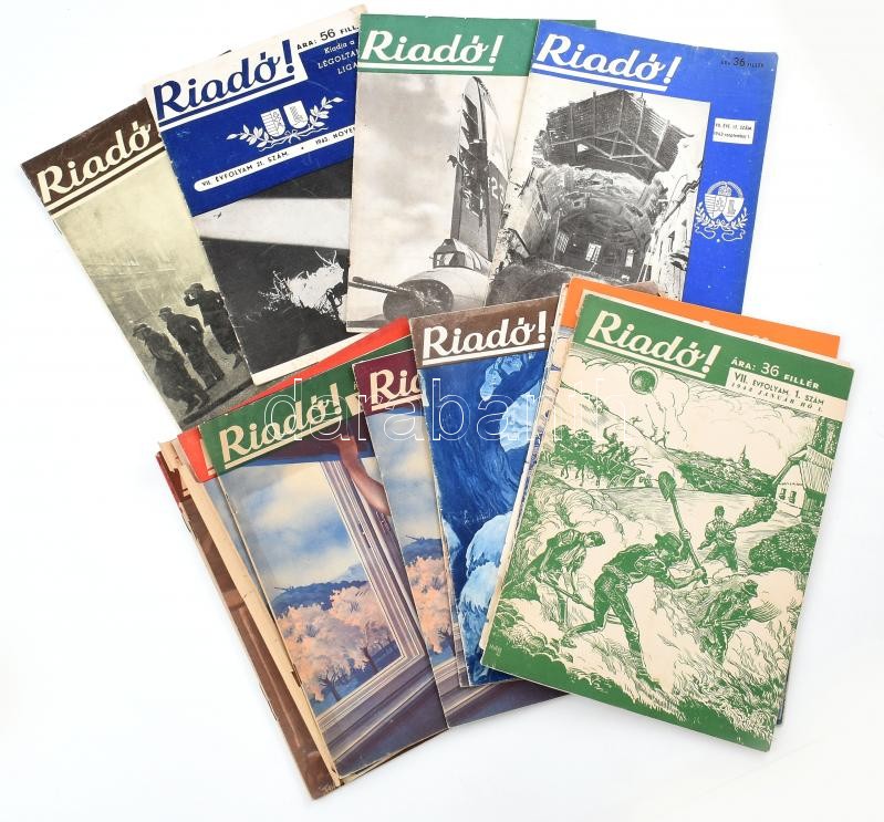 1943 Riadó! A Légoltalmi Liga folyóirata VII. évf. 16 száma, (1. (x2),2.,3., 5.,6., 7., 8., 10., 11.,12., 16.,17., 19., 22. ) Változó állapotban, az 1. számból duplum van, de a duplumnak nincs meg a borítója és szétesik, a 2. szám két lapjából külön duplum van, a 11. számborítója szakadt.