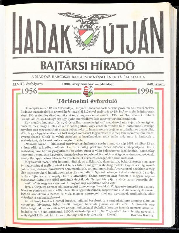 Beschreibung: 1996-1998 Hadak Útján. Bajtársi híradó számai egybekötve: XLVIII. évf. 1996. szept.-okt. (1956-1996, Történelemi évforduló), 448. sz.,
