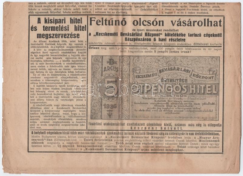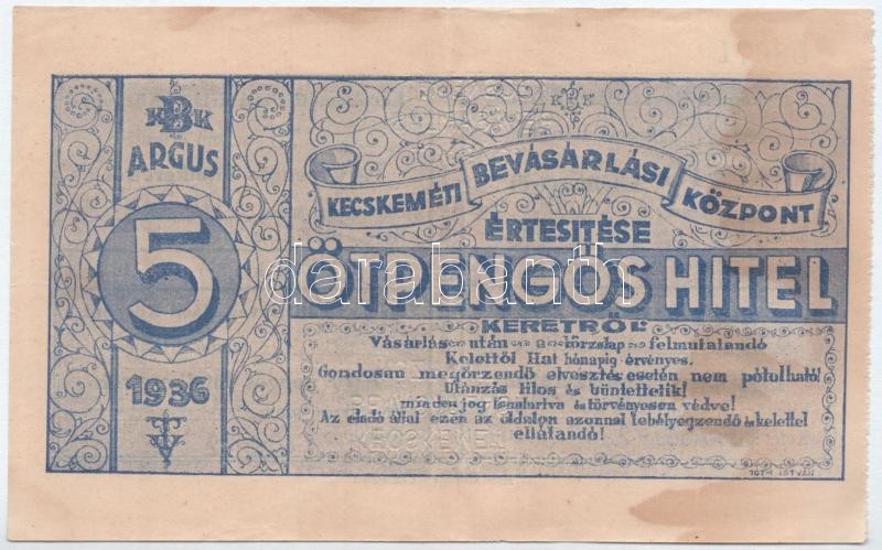 1936. Kecskeméti Bevásárlási Központ értesítése 5P hitel keretről, zöld színben, hátoldalán bélyegzéssel + újságcikk a hitelkeretről a "Kecskeméti Lapok" 1936. november 29-i számából T:II,III fo.