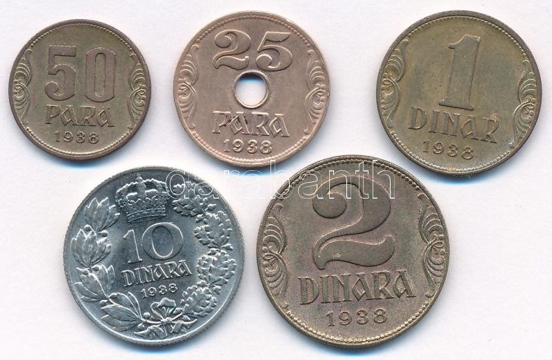Jugoszlávia 1938. 25p-10D (5xklf) T:1-,2 patina Yugoslavia 1938. 25 Para-10 Dinara (5xdiff) C:AU,XF patina Krause KM#17-20, #22