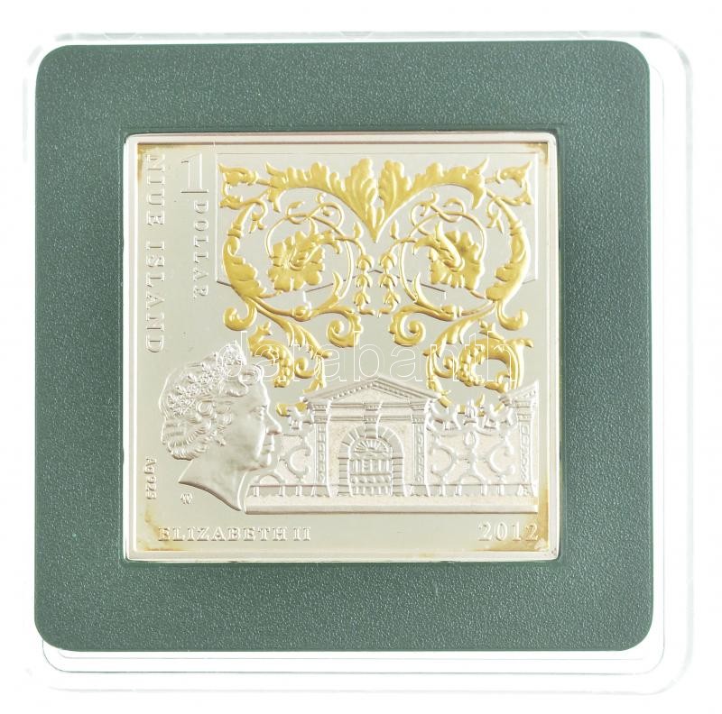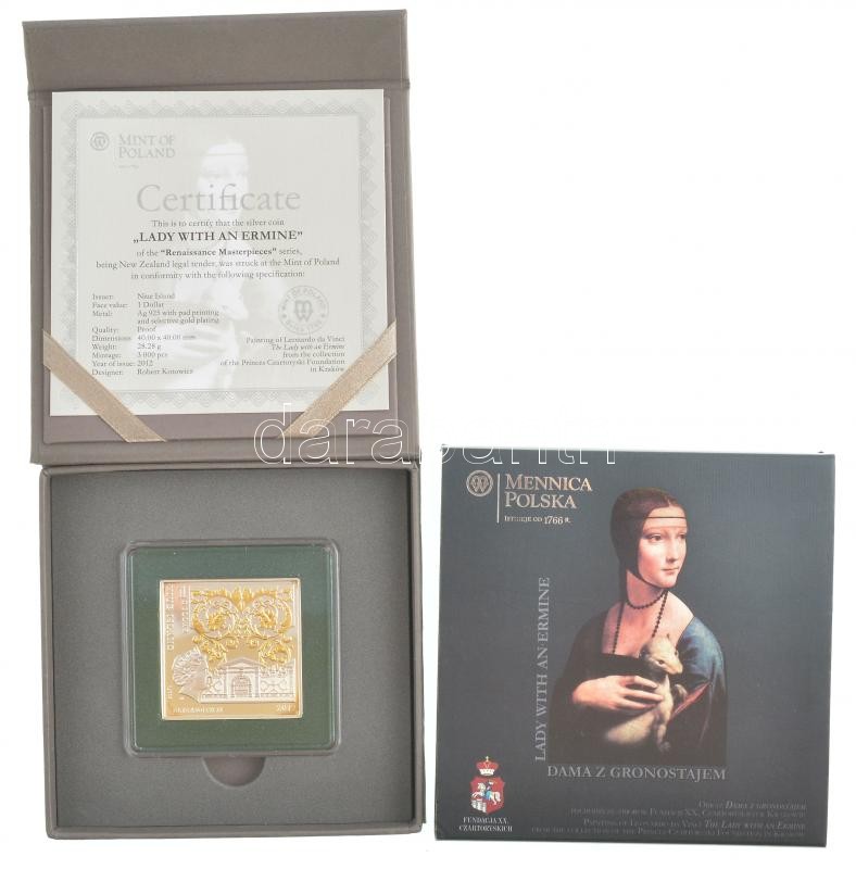 Niue 2012. 1$ "II. Erzsébet / Hölgy hermelinnel" részben aranyozott, részben multicolor Ag, a Lengyel Pénzverde tanúsítványával és eredeti dobozával T:PP Niue 2012. 1 Dollar "Elizabeth II / Lady with an ermine" partially gilt and multicolor Ag, original certificate and box of the Polish Mint C:PP Krause KM#954
