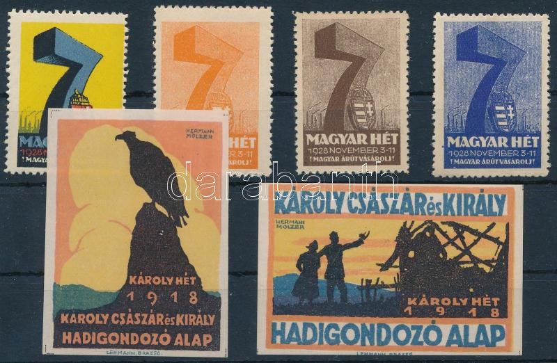 Beschreibung: 1918-1928 7 db klf régi magyar levélzáró, közte Hadigondozó alap pár, 1928-as Magyar hét sor (4 db)
