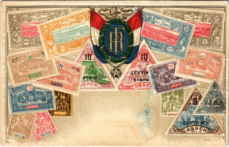 Beschreibung: Stamps from the French colonial empire. Carte philatelique. O.Z.M. No. 75. Emb. litho (lyuk / pinhole)