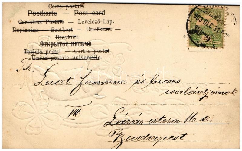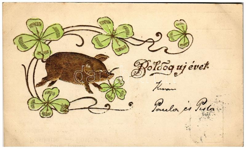 1903 Boldog Újévet! / New Year greeting art postcard with golden pig a... https://www.darabanth.com/de/416-Fernauktion/416.0/Ansichtskarten/GruC39Fkarten-Feste~2000076/1903-Boldog-Ujevet-New-Year-greeting-art-postcard-with-golden-pig-and-clovers-Emb-litho~II2609227