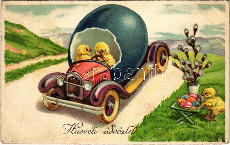 1935 Húsvéti üdvözlet / Easter greeting art postcard with chicken in a... https://www.darabanth.com/de/416-Fernauktion/416.0/Ansichtskarten/GruC39Fkarten-Feste~2000076/1935-Husveti-udvozlet-Easter-greeting-art-postcard-with-chicken-in-an-eggmobile-EK~II2609224