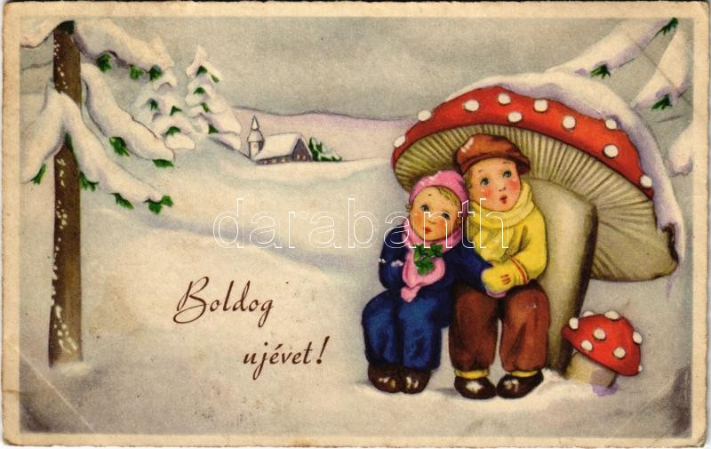 1941 Boldog Újévet! / New Year greeting art postcard with children sit... https://www.darabanth.com/de/416-Fernauktion/416.0/Ansichtskarten/GruC39Fkarten-Feste~2000076/1941-Boldog-Ujevet-New-Year-greeting-art-postcard-with-children-sitting-under-a-mushroom-fl~II2609231