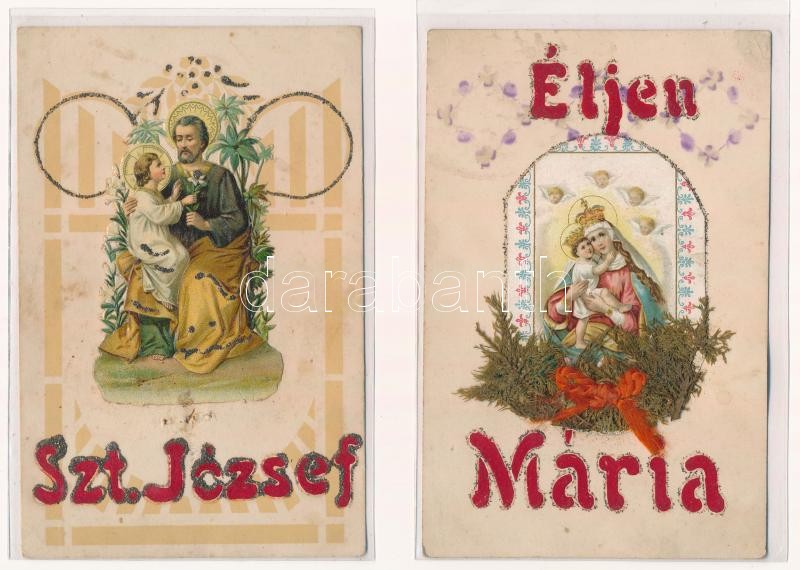 2 db RÉGI rátétes üdvözlőlap: Éljen Mária, Szent József / 2 pre-1945 m... https://www.darabanth.com/de/416-Fernauktion/416.0/Ansichtskarten/GruC39Fkarten-Feste~2000076/2-db-REGI-ratetes-udvozlolap-Eljen-Maria-Szent-Jozsef-2-pre-1945-motive-postcards-gree~II2611715