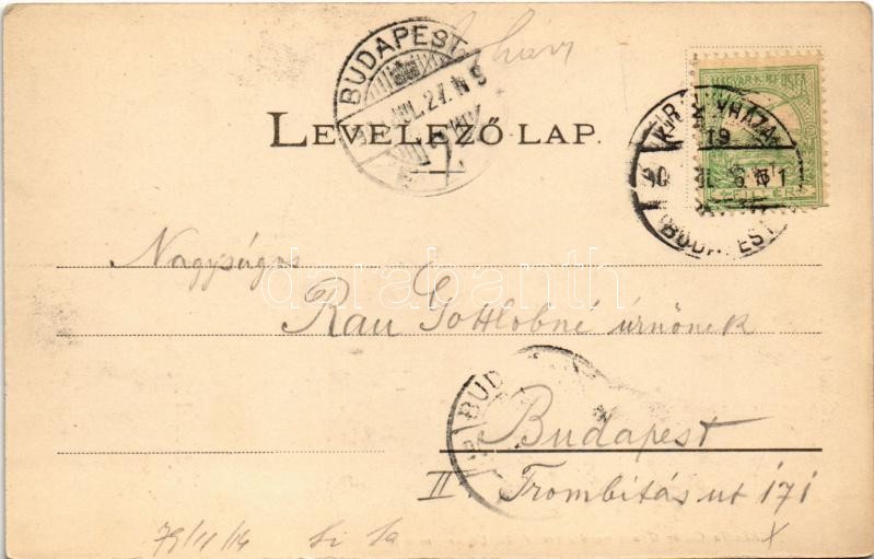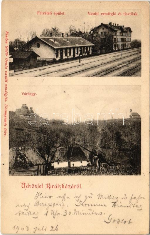 1903 Királyháza, Korolevo, Královo nad Tisou; vasútállomás, felvételi épület, vasúti vendéglő és tisztilak, várhegy, várrom. Gödör Gyula vasúti vendéglős kiadása / railway station, railway restaurant, officers' apartments, castle hill, castle ruins