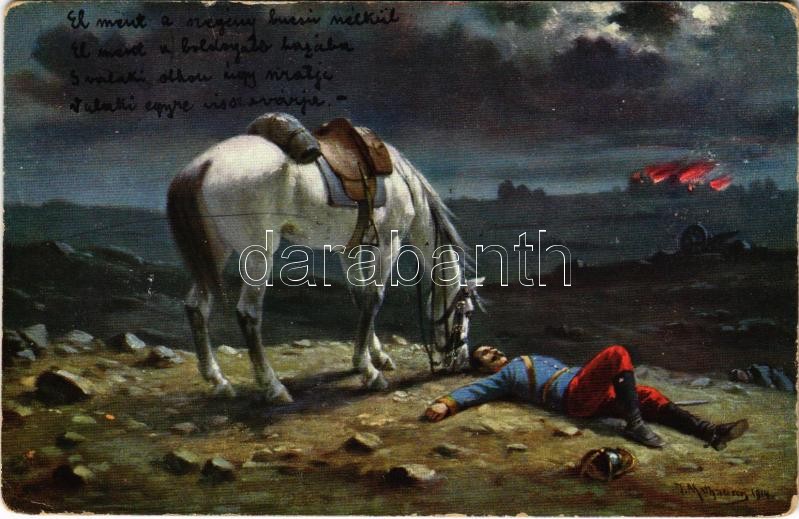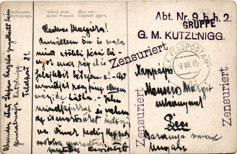 Beschreibung: 1915 Verny druh / Guter Freund / WWI Austro-Hungarian K.u.K. military art postcard, soldier's death s: Mathauser + "Abt. Nr. 9. b.h. 2. Gruppe G.M. KUTZLNIGG" (EK)
