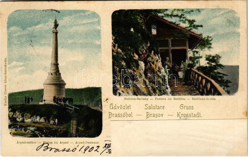 Beschreibung: 1902 Brassó, Kronstadt, Brasov; Árpád szobor, Millenniumi emlékmű, Bethlen-barlang. Ciurcu könyvkereskedés kiadása / Statua lui Arpad, Pestera lui Bethlen / Arpad-Denkmal, Bethlens-Grotte / Millennium monument, cave (ragasztónyom / glue mark)