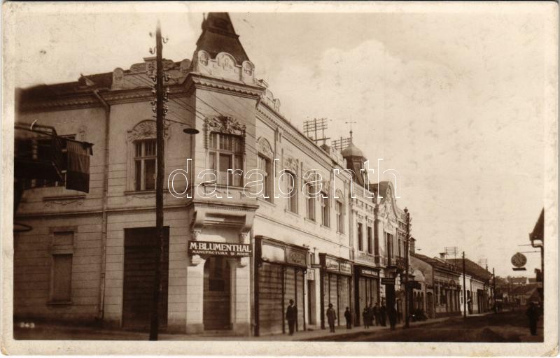 Beschreibung: 1940 Csíkszereda, Miercurea Ciuc; Bratianu utca, szanatórium, M. Blumenthal és Szvoboda Miklós üzlete, gyógyszertár / street, sanatorium, shops, pharmacy