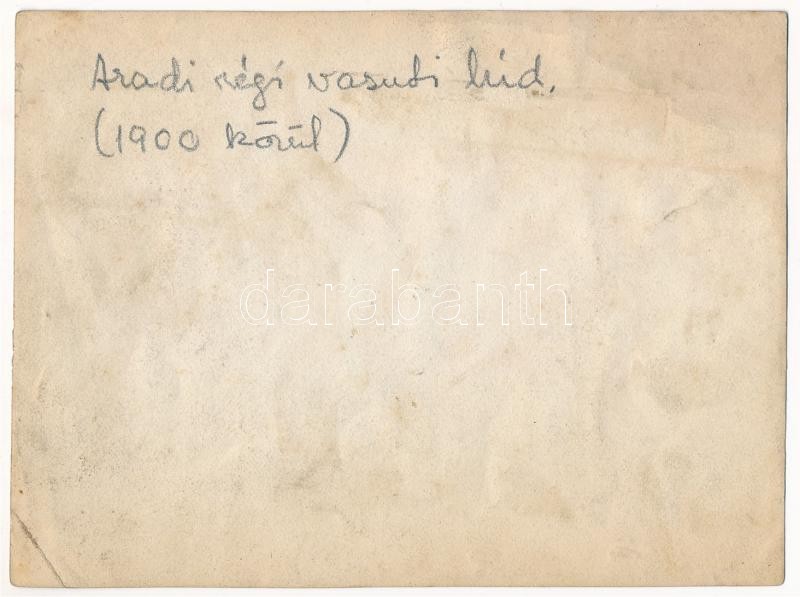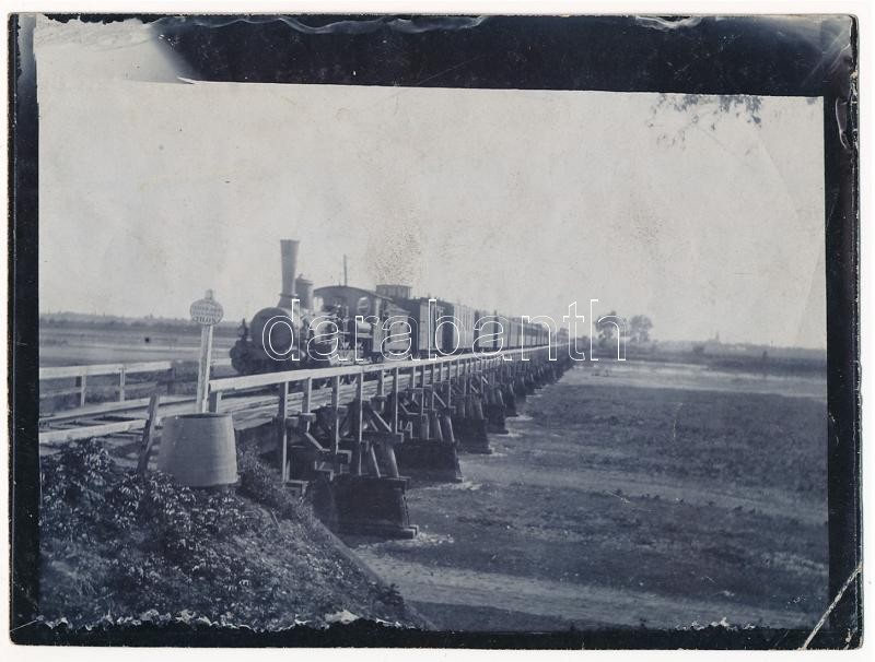 Beschreibung: Arad, Aradi régi vasúti hÃd (1900 körül), gÅ‘zmozdony, vonat, "Idegeneknek a töltésen és a hÃdon való járás tilos!" tábla / railway bridge, locomotive, train. photo (non PC) (vágott / cut)