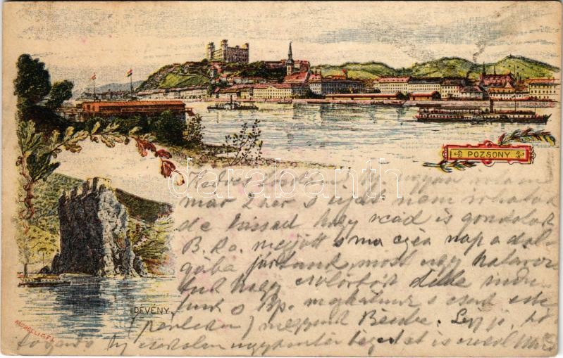 1897 (Vorläufer) Pozsony, Pressburg, Bratislava; Ezredéves Országos Kiállítás, Dévényi vár, gőzhajók / Devín castle, steamships, general view. Hungarian Millennium Exhibition, floral litho s: Morelli, Dörre T. + barna 2 Kr. Ga.