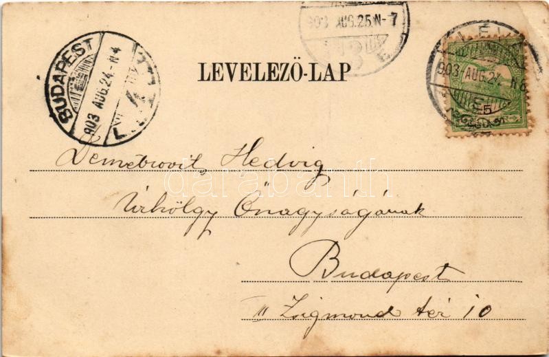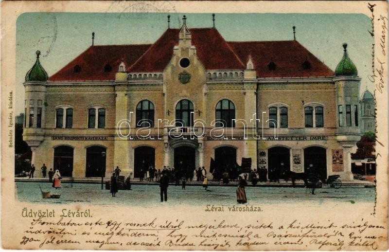 1903 Léva, Levice; Városháza, Lang Központi kávéháza, Kovács Sándor, Schweihs és Trebitsch, Amstetter Imre üzlete. Schulcz Ignác kiadása / town hall, café, shops (EK)
