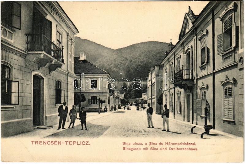 1912 Trencsénteplic, Trencianske Teplice; Sina utca, a Sina és Háromsz... https://www.darabanth.com/de/416-Fernauktion/416.0/Ansichtskarten/Slowakei~2000010/1912-Trencsenteplic-Trencianske-Teplice-Sina-utca-a-Sina-es-Haromsziv-hazzal-Sinagasse-mit~II2620432