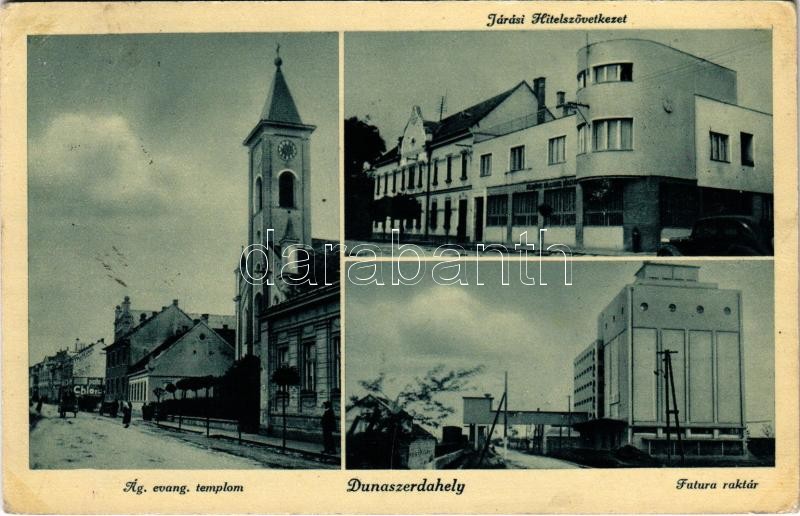 Beschreibung: 1942 Dunaszerdahely, Dunajská Streda; Evangélikus templom, zsinagóga, Járási Hitelszövetkezet, Futura raktár / Lutheran church, synagogue, credit union, warehouse (EK)
