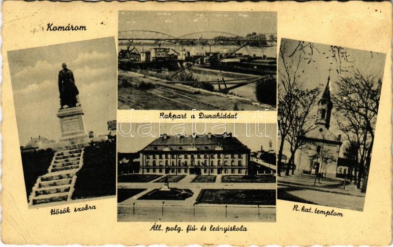 1942 Komárom, Komárno; Hősök szobra, emlékmű, Rakpart a Duna híddal, Római katolikus templom, Állami polgári fiú és leányiskola / WWI military monument, Danube bridge, quay, Catholic church, school (EB)