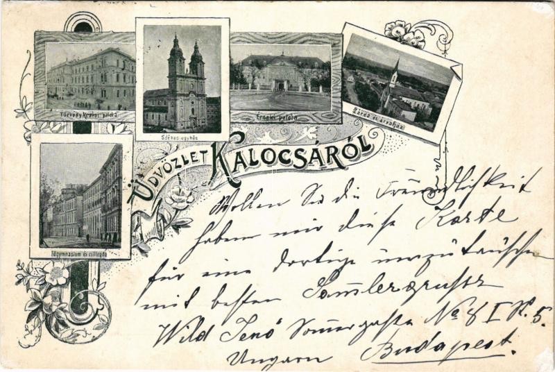 Beschreibung: 1899 (Vorläufer) Kalocsa, Törvénykezési palota, székesegyház, főgimnázium és csillagda, érseki palota, zárda és árvaház. Art Nouveau, floral (EK)