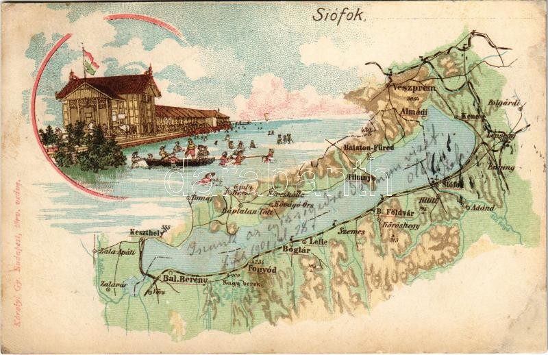 Beschreibung: 1901 Siófok, Balaton térkép, fürdő. Károlyi Gy. kiadása, litho (r)