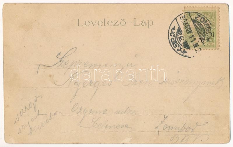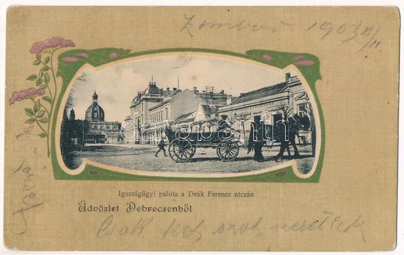1903 Debrecen, Igazságügyi palota a Deák Ferenc utcán, Kávéház és szálloda a Zöldfához, zsinagóga. Szecessziós virágos litho keret / Art Nouveau floral litho frame (kicsit ázott sarok / slightly wet corner)