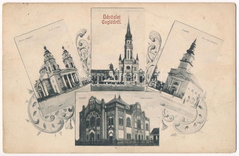 1908 Cegléd, Református templom, Evangélikus templom, Római katolikus ... https://www.darabanth.com/de/416-Fernauktion/416.0/Ansichtskarten/Ungarn~2000012/1908-Cegled-Reformatus-templom-Evangelikus-templom-Romai-katolikus-templom-Zsido-templom-z~II2618544