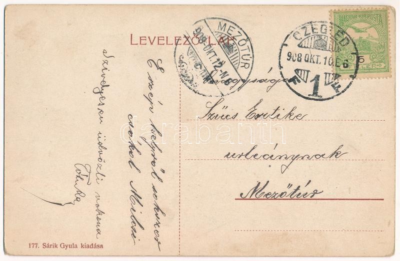 Beschreibung: 1908 Cegléd, Református templom, Evangélikus templom, Római katolikus templom, Zsidó templom, zsinagóga. Sárik Gyula kiadása. Art Nouveau (fa)