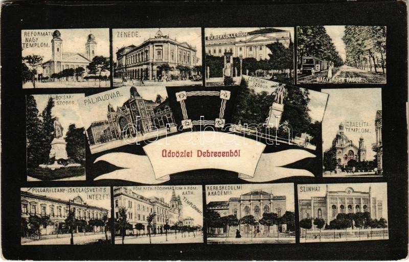 1912 Debrecen, Református nagytemplom, Zenede, Református kollégium, Nagyerdei fasor, villamos, Bocskai szobor, Pályaudvar, vasútállomás, Izraelita templom, zsinagóga, Polgári leányiskola (Svetits intézet), Római katolikus templom és főgimnázium, Kereskedelmi Akadémia, Színház. Kónya dohánytőzsde kiadása (EK)