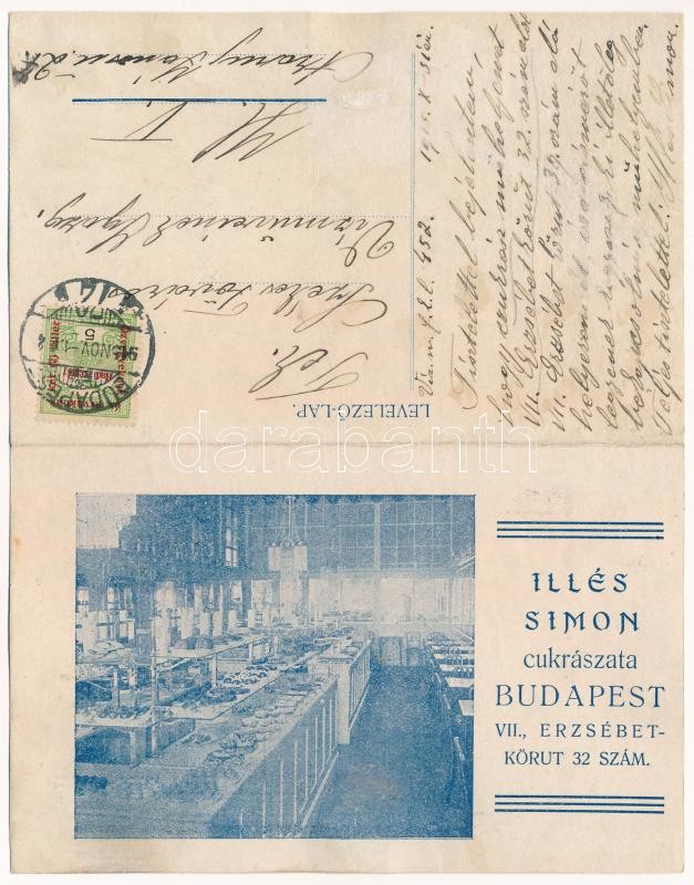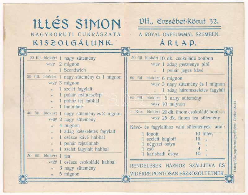 1915 Budapest VII. Illés Simon cukrászata a Royal Orfeummal szemben, belső. Kihajtható képeslap belül árlappal. Utassy Béla kiadása. Erzsébet körút 32. (r)