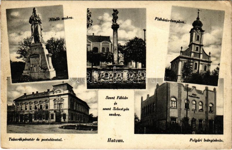 Beschreibung: 1940 Hatvan, Hősök szobra, emlékmű, Szent Fábián és Szent Sebestyén szobra, Plébániatemplom, Polgári leányiskola, Takarékpénztár és postahivatal (EK)
