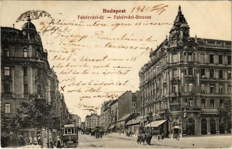 Beschreibung: Budapest XI. Fehérvári út (ma Bartók Béla út), villamos, Gellért kávéház, Gebauer József üzlete, Egyesült Budapesti Fővárosi Takarékpénztár (Rb)