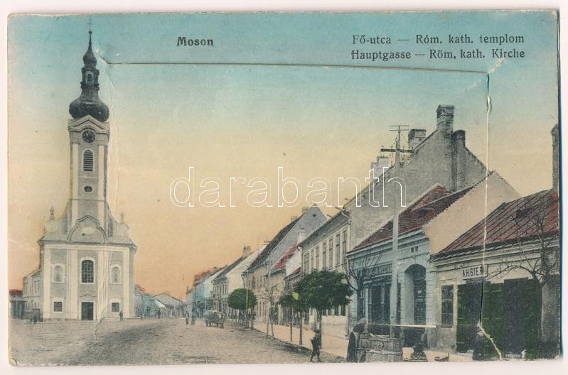 Moson (Mosonmagyaróvár), Fő utca, Római katolikus templom, A. H. Stern... https://www.darabanth.com/de/416-Fernauktion/416.0/Ansichtskarten/Ungarn~2000012/Moson-Mosonmagyarovar-Fo-utca-Romai-katolikus-templom-A-H-Stern-uzlete-Freitag-Frigyes-~II2622126