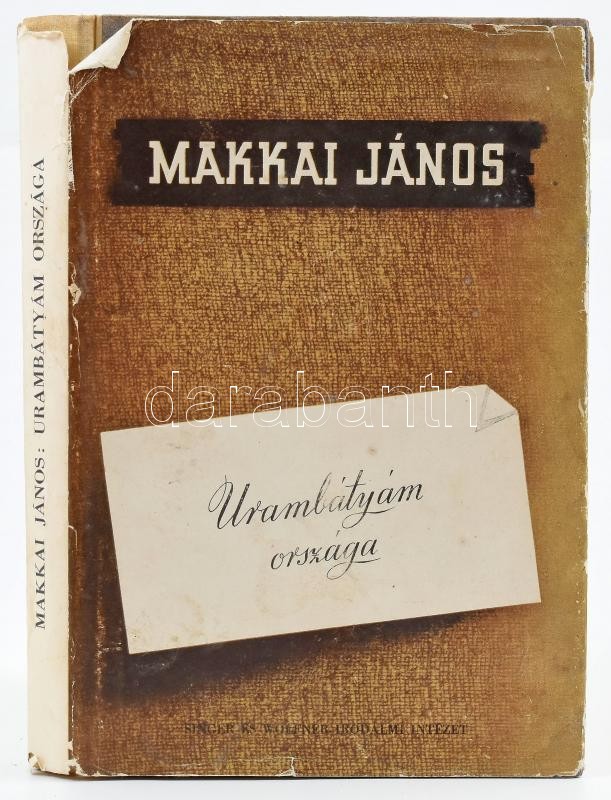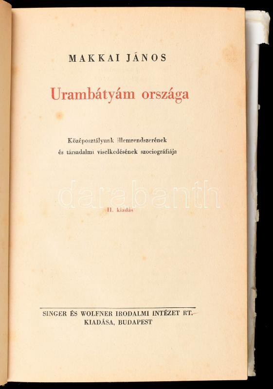 Makkai János: Urambátyám országa. Középosztályunk illemrendszerének és társadalmi viselkedésének szociográfiája. Bp., én., Singer és Wolfner. II. kiadás. Kiadói kissé kopott félvászon-kötés, kiadói kissé szakadt papír védőborítóban, foltos borítóval.