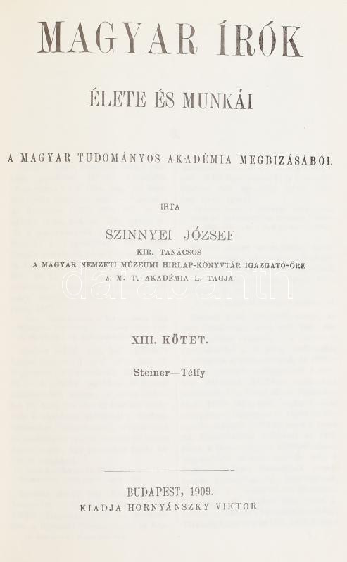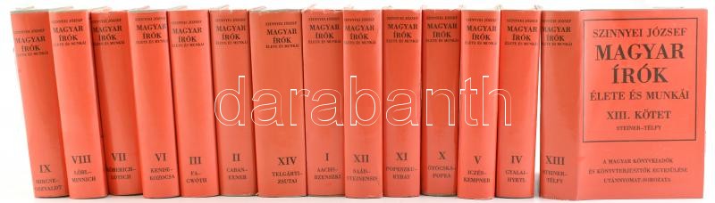 Szinnyei József: Magyar írók élete és munkái I-XIV. köt. Magyar Könyvkiadók és Könyvterjesztők Egyesülése Utánnyomat Sorozata. Bp., 1980-1981., Magyar Könyvkiadók és Könyvterjesztők Egyesülése. Kiadói egészvászon-kötések, kiadói papír védőborítókban, jó állapotban.