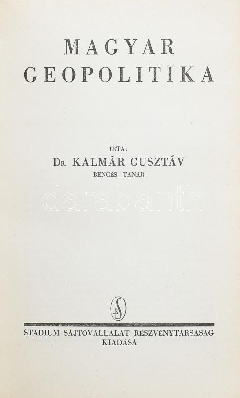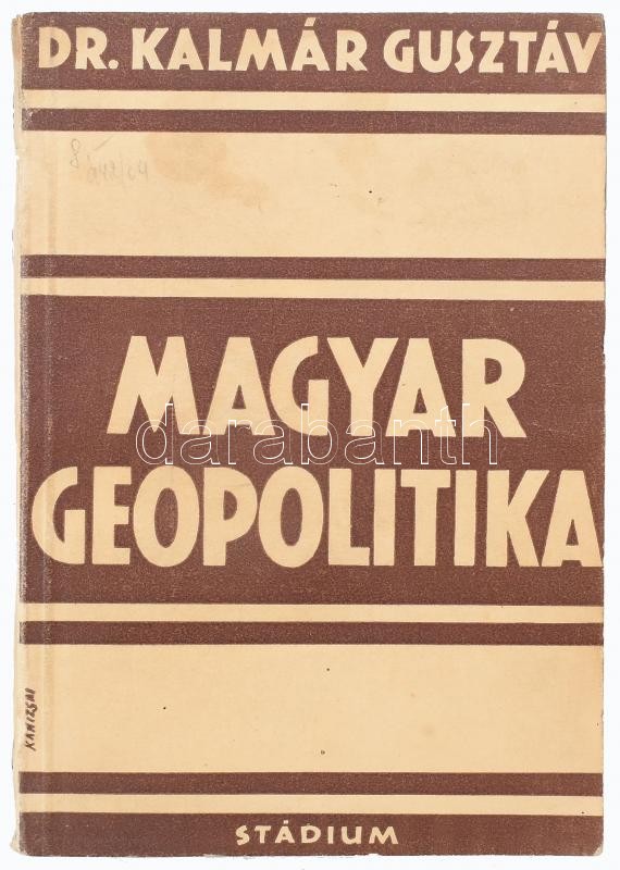 Dr. Kalmár Gusztáv: Magyar geopolitika. Bp., [1942], Stádium, 191 p. E... https://www.darabanth.com/de/416-Fernauktion/416.0/Bucher/Bucher-Geschichte~1000009/Dr-Kalmar-Gusztav-Magyar-geopolitika-Bp-1942-Stadium-191-p-Elso-kiadas-Kiadoi-papi~II2614303