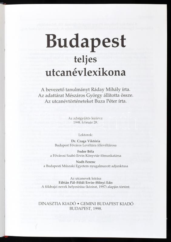 Budapest teljes utcanévlexikona. Ráday Mihály bevezető tanulmányával. Az adattárat Mészáros György állította össze. Az utcanévtörténeteket Buza Péter írta. Bp., 1998., Dinasztia-Gemini. Kiadói papírkötés.