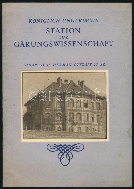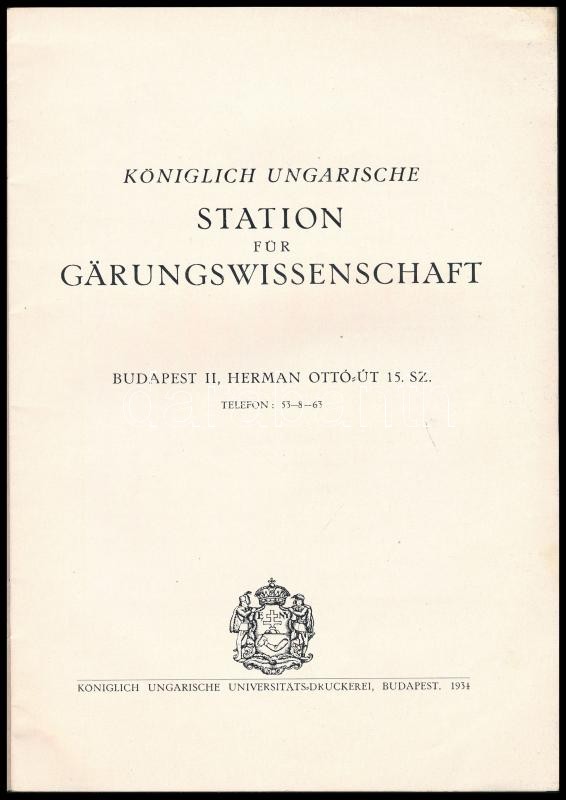 Königlich Ungarische Station für Gärungswissenschaft. (Budapest II, Herman Ottó út 15. sz.) Bp., 1934, Königlich Ungarische Universitäts-Druckerei (Kir. M. Egyetemi Ny.), 19+1 p. Német nyelven. Kiadói papírkötés.