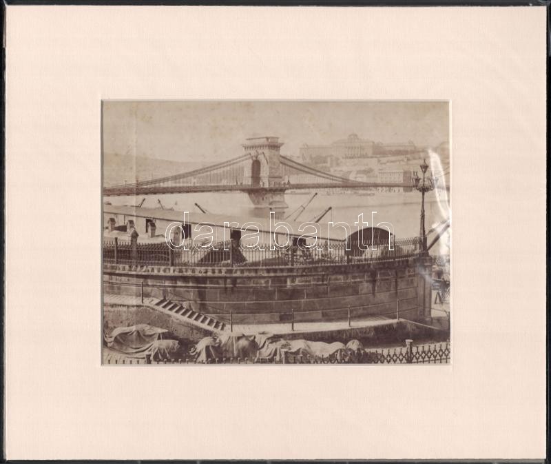 cca 1880 Budapest, a Lánchíd és a Budai Vár panorámaképe a pesti rakpartról, Klösz György alkotása, fotó paszpartuban, felületén törésnyom, kissé foltos, 16,5×22 cm