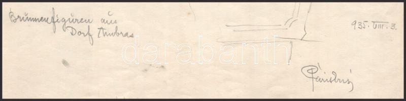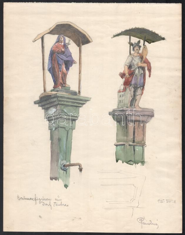 Páris Erzsi (1887-?): Kutakat díszítő szobrok Ambrasban (Brunnenfiguren aus Dorf Ambras), 1935. Ceruza, akvarell, papír, jelzett, 32x24 cm / watercolour and pencil on paper, signed