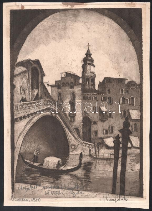 Beschreibung: Szentgyörgyvári Gyenes Lajos (1890-1971): Venezia. Rézkarc, papír, jelzés nélkül, ismeretlen ajándékozási sorokkal, körbevágva, foltos, 33x23,5 cm