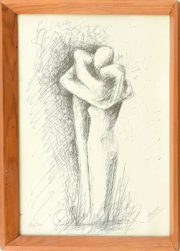 Beschreibung: Olvashatatlan jelzéssel: Szerelmespár. Nyomat, papír. Számozott (104/200). Üvegezett fakeretben. 47×34 cm.